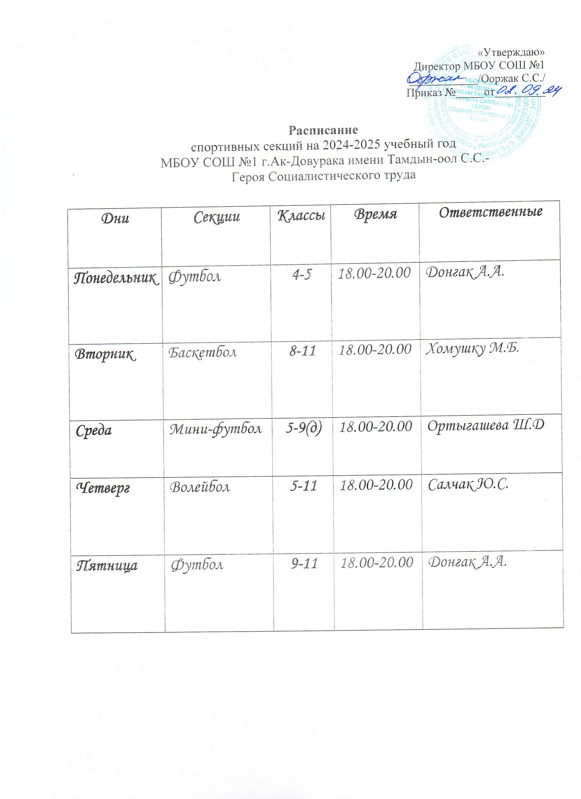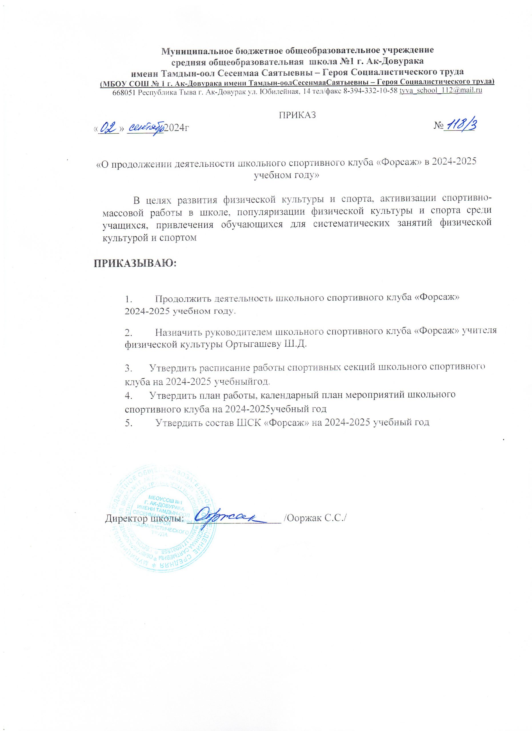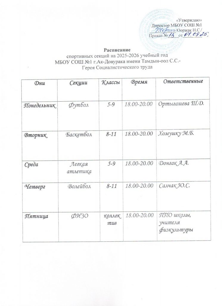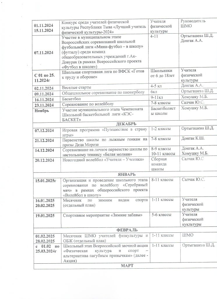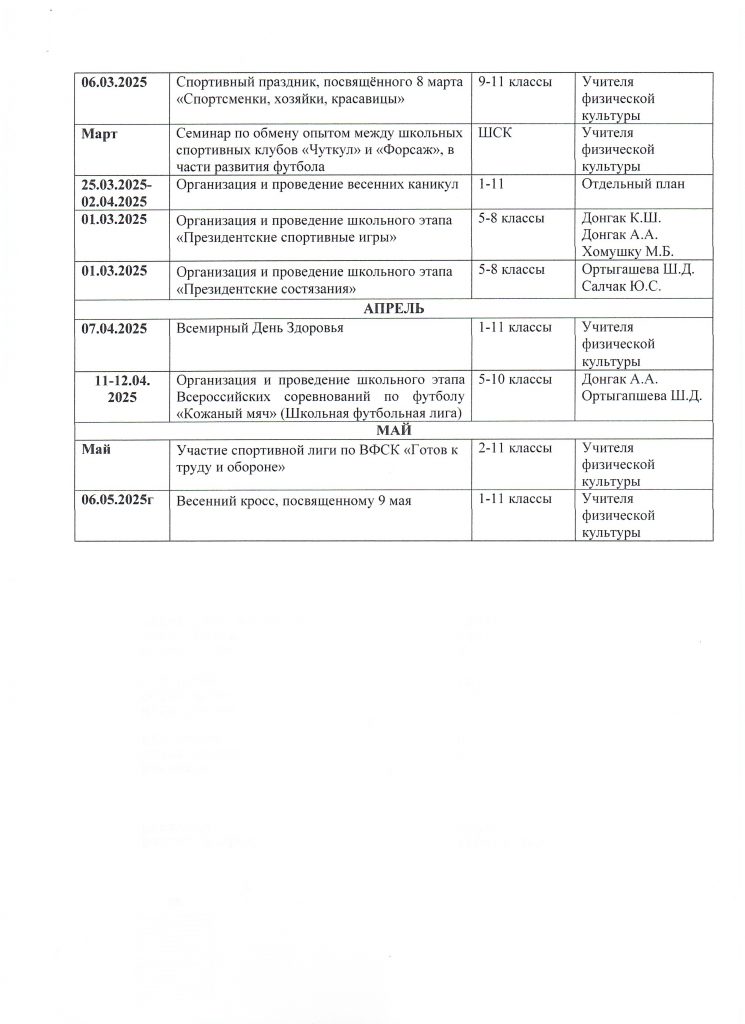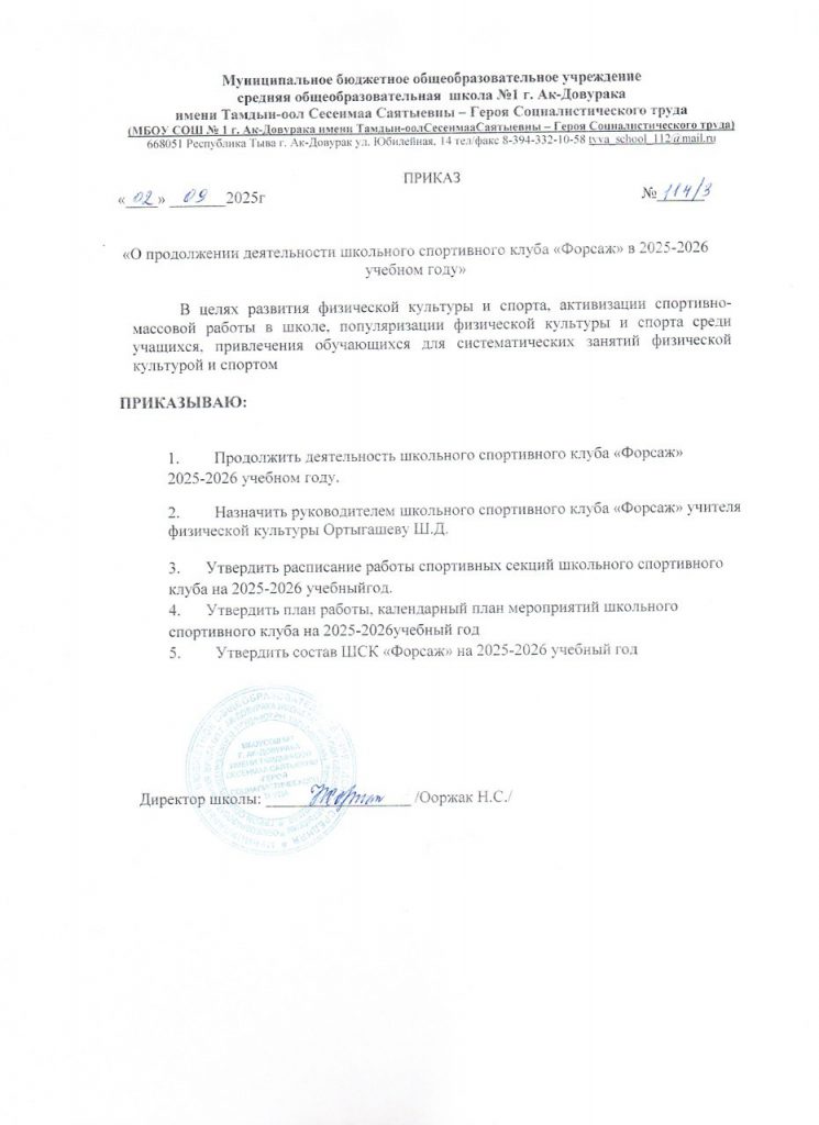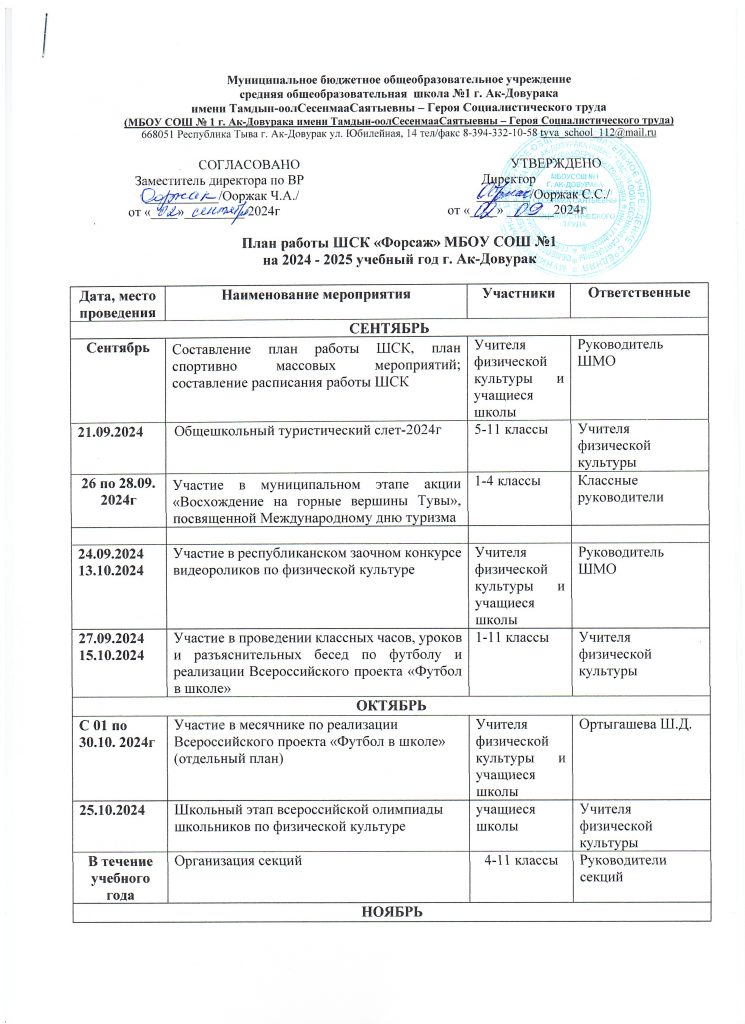 План работы ШСК «Форсаж» МБОУ СОШ №1 г.Ак-Довурак